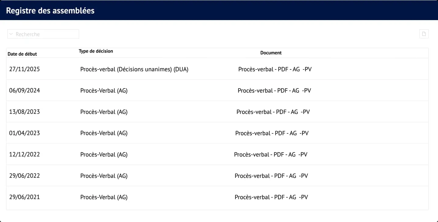 Le registre des mouvements de titres est tenu automatiquement dans la solution. Chaque registre est digitalisé est conforme à la législation, et opposable au CAC. Il permet d'être auditable facilement et peut être accessible à tous investisseurs ou avocats.